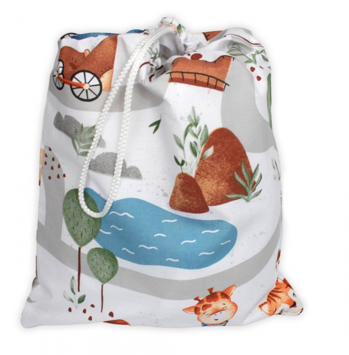 Pytlík na přezůvky 40x32cm, bavlna, ZOO ve vlaku, bílá s potiskem