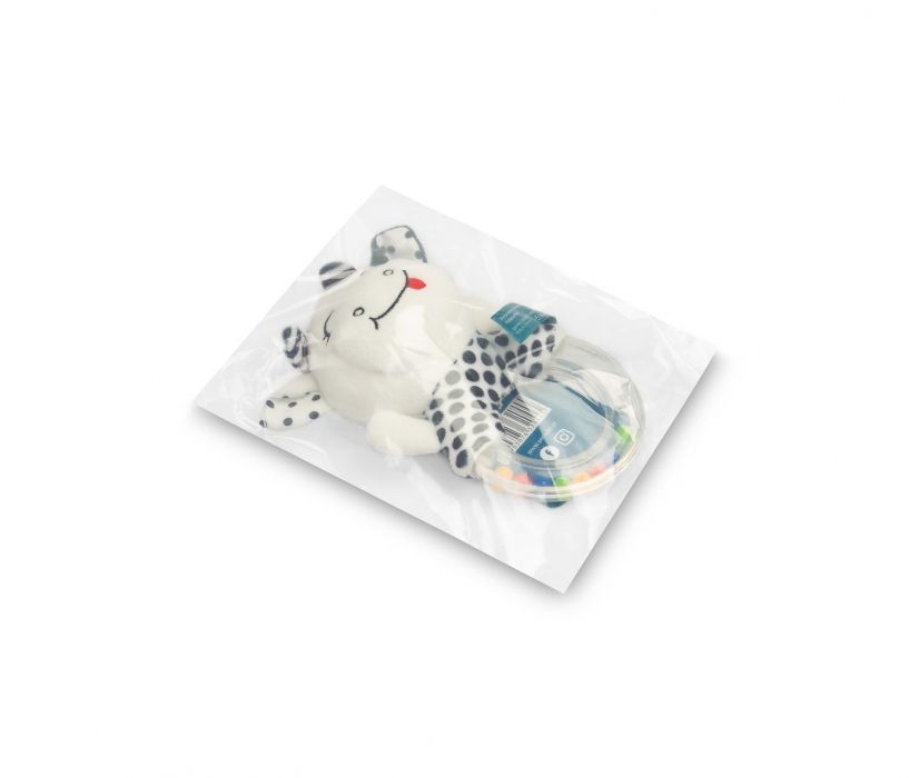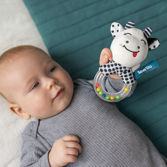 Uvnitř chrastítka se nacházejí jemné korálky, které při každém pohybu vydávají příjemný zvuk, podporující rozvoj sluchu a koordinace pohybů.