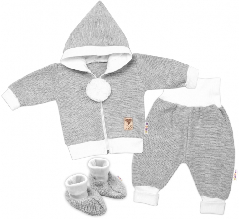 3-dílná souprava Hand made, pletený kabátek, kalhoty a botičky, šedá, vel. 62