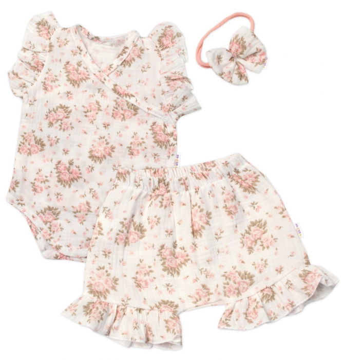 Zavinovací body, kraťasky + čelenka, mušelín, Pivoňky, Baby Nellys, smetanové, vel. 86