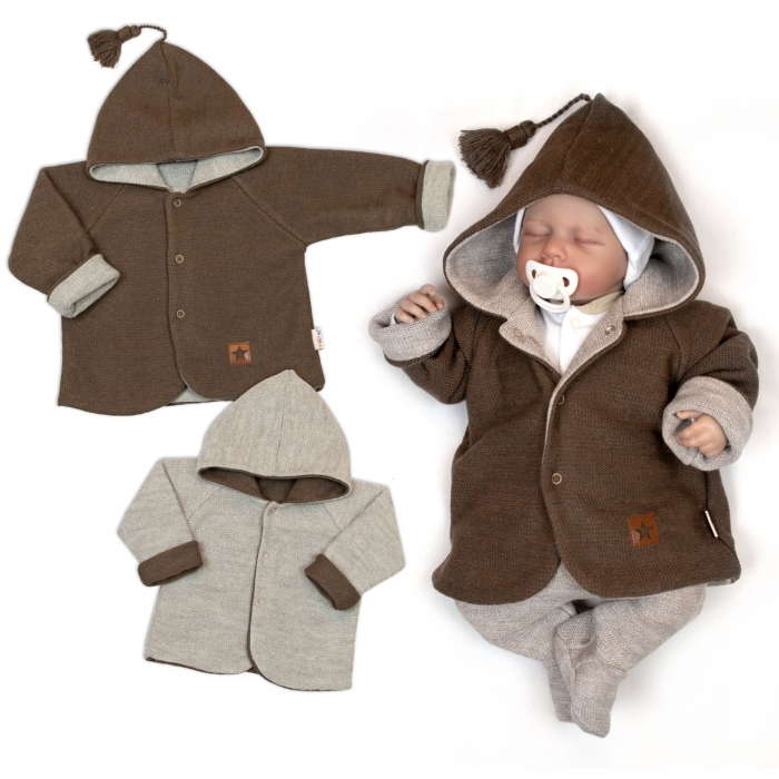Pletený dětský kabátek/bundička s kapucí Star, oboustranný - hnědý, béžový, vel. 80