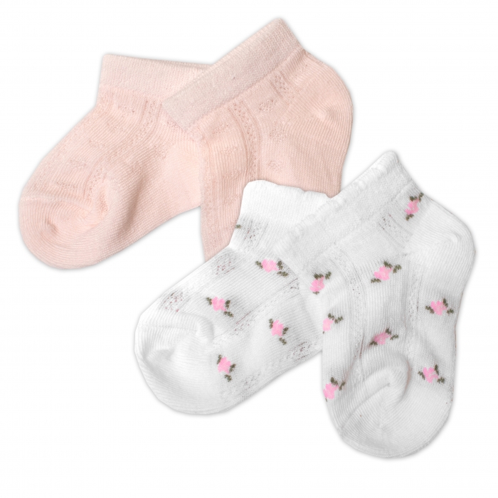 Sada obsahuje 2 páry ponožek - 1x růžové, 1x bílé s kytičkama.