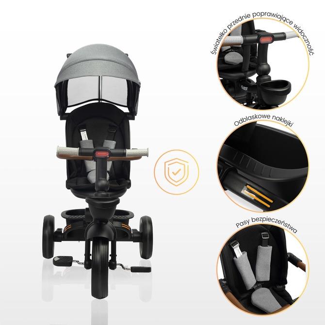 Bezpečnost na prvním místě: 3bodové bezpečnostní pásy, ochranné madlo a odrazky pro vyšší viditelnost.